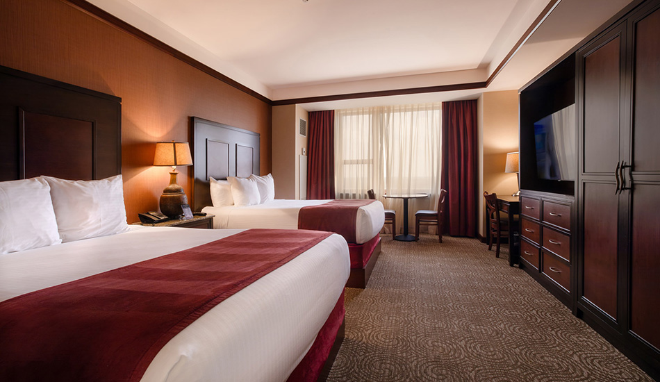 A well-designed non-smoking room with two queen beds, walk-in shower, dedicated makeup vanity, and workspace. Located just steps from the casino floor for easy access to all resort amenities.